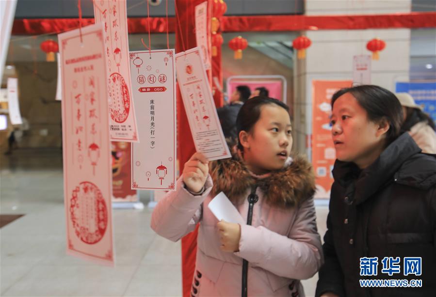 2月16日,市民在山东省临沂市图书馆猜灯谜。 元宵节将至,人们走出家门,赏灯猜谜,喜迎佳节。 新华社发(许传宝 摄)