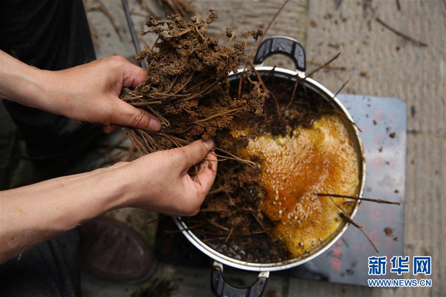 4月24日,在贵州省丹寨县南皋乡石桥村,王兴武在用天然植物制作彩色纸染料。