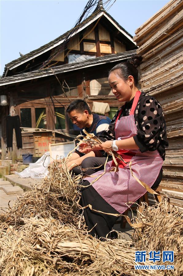 4月24日,在贵州省丹寨县南皋乡石桥村,王兴武(左)和妻子在处理刚刚收购的造纸原料。 新华社发(黄晓海 摄)