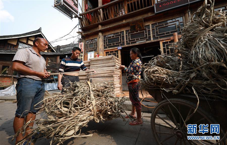 4月24日,在贵州省丹寨县南皋乡石桥村,王兴武(中)在称造纸原料的重量。 新华社发(黄晓海 摄)