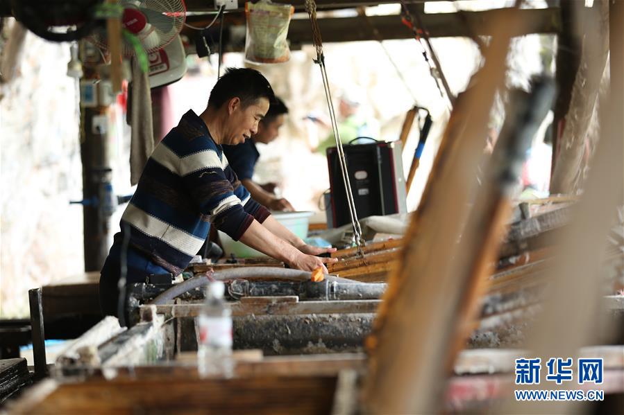4月24日,在贵州省丹寨县南皋乡石桥村皮纸作坊,王兴武和工匠们在制作手工皮纸。新华社发(黄晓海 摄)