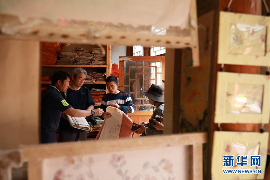 4月24日,在贵州省丹寨县南皋乡石桥村手工皮纸展示馆,王兴武(右二)在向日本游客介绍彩色皮纸制作技艺。新华社发(黄晓海 摄)