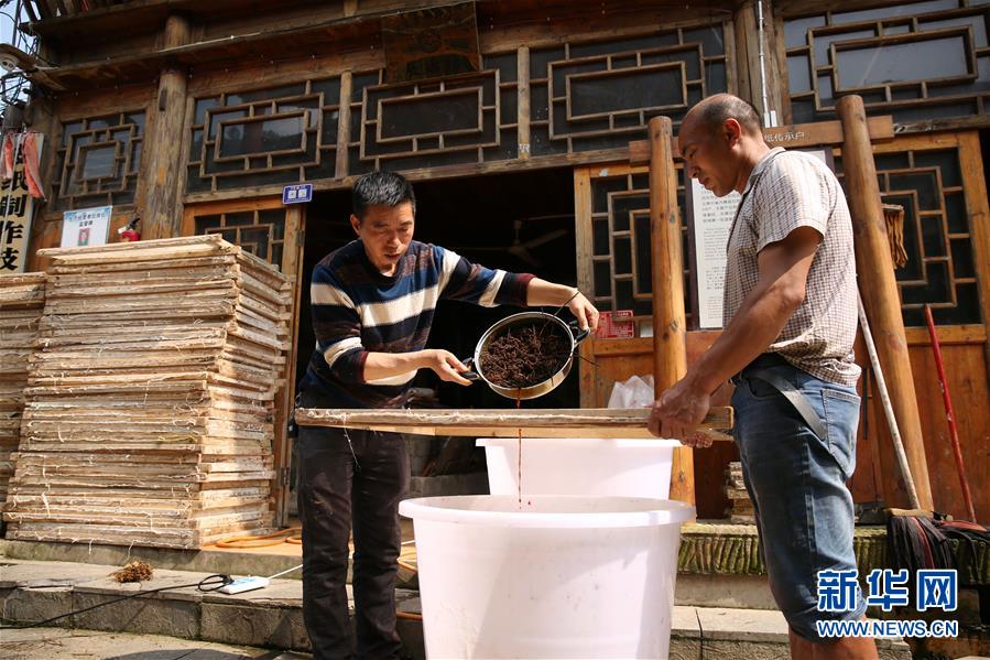 4月24日,在贵州省丹寨县南皋乡石桥村,王兴武(右)把制作好的天然植物染料过滤到纸浆里。 新华社发(黄晓海 摄)