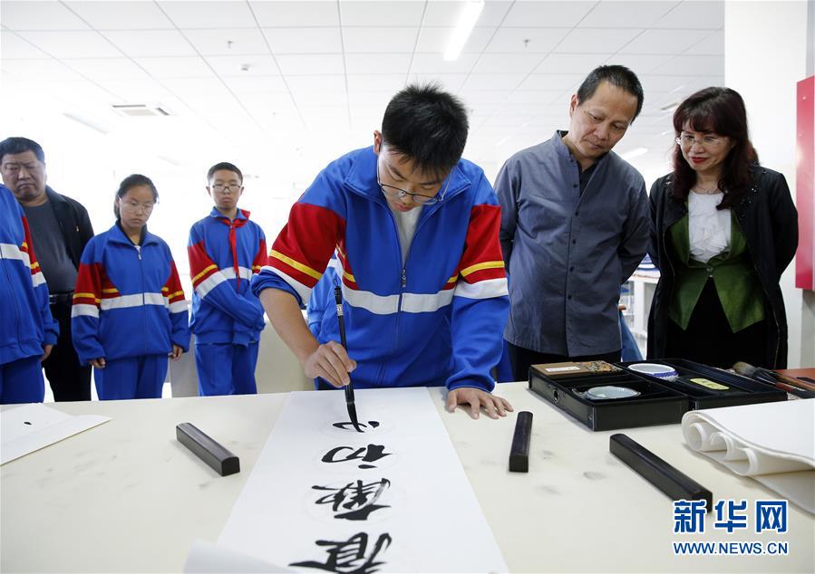 5月5日,中学生在“一缕墨香”书法交流活动现场书写。 新华社发(周良 摄)