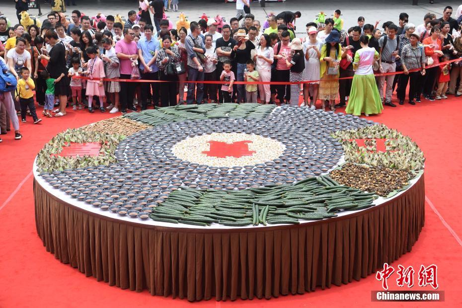 6月2日,端午节前夕,杭州宋城景区准备了一个直径8米、由黄鱼、黄瓜、黄鳝、咸鸭蛋、雄黄酒组成的“五黄”拼盘,让来自全国各地的游客免费品尝,提前体验江南特有的传统端午习俗。景区负责人介绍,端午小长假期间,游客在杭州宋城可以品尝“五黄”,免费体验包粽子、做香包等传统习俗,过一个传统的端午节。 杨晨 摄