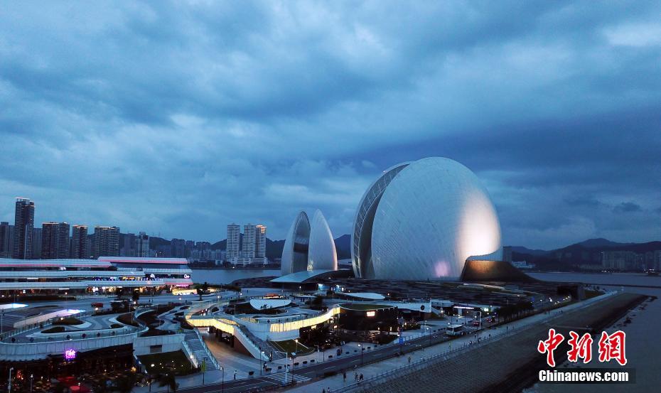 9月3日晚,航拍珠海大剧院。珠海大剧院坐落于珠海市情侣路野狸岛北部填海区,是中国唯一建设在海岛上的歌剧院,设计造型为“日月贝”,即一大一小的贝壳,其中大贝壳“日贝”高90米,是一个可容纳近1600人的大剧院,小贝壳“月贝”是500座的多功能厅,适合室内音乐会、小型话剧等,剧院内设有观景台,可以观山看海。中新社记者 姬东 摄