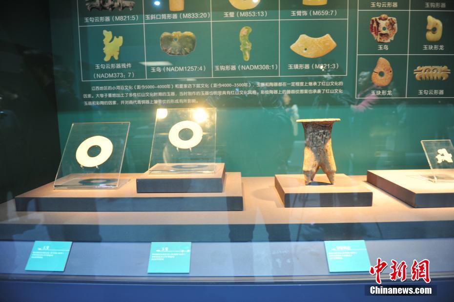 10月16日,展出的玉璧及陶鬲。当日,“又见红山”精品文物展在辽宁省博物馆举行,共有玉玦形猪龙、玉C形龙、玉勾云形器、玉凤等200余件红山文化精品文物展出。 中新社记者 于海洋 摄