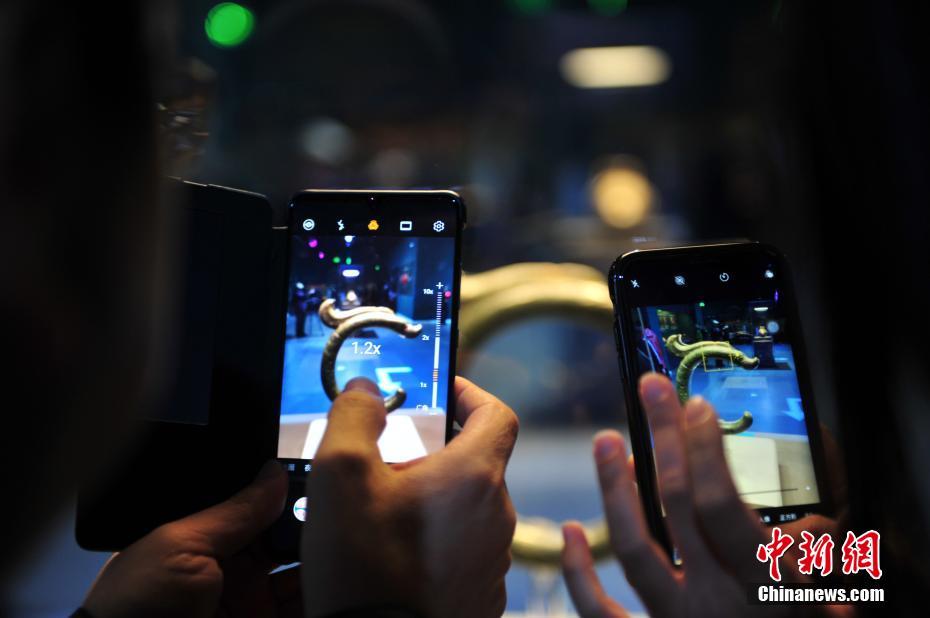 10月16日,观众在拍摄文物玉C形龙。当日,“又见红山”精品文物展在辽宁省博物馆举行,共有玉玦形猪龙、玉C形龙、玉勾云形器、玉凤等200余件红山文化精品文物展出。 中新社记者 于海洋 摄