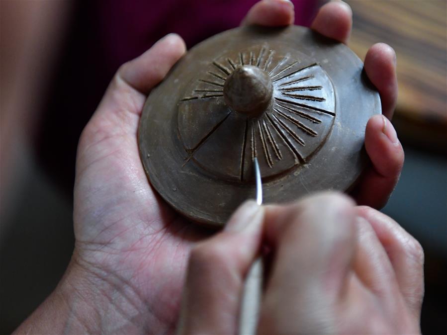 班玛县黑陶匠人卡昂在给壶盖刻花纹(11月11日摄)。新华社记者 张龙 摄