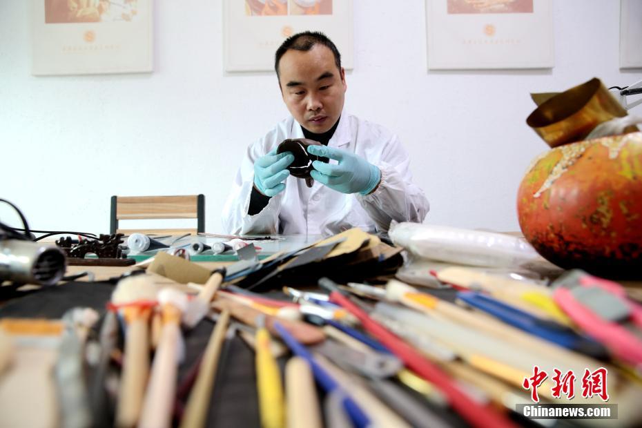 12月16日,李程在位于西安临潼的工艺坊内修复一件茶壶。秦岭是中国生漆主要的原产地,也是中国漆艺发源地之一,大漆修复工艺在陕西流传已久,木制家具、破碎的陶瓷、断裂的木琴等都可用大漆进行粘接修复。作为从事传统漆器的手艺人,李程多年来在他创办的大唐漆艺坊里不断钻研着大漆修复工艺,要将其传承发展下去。 中新社记者 张远 摄