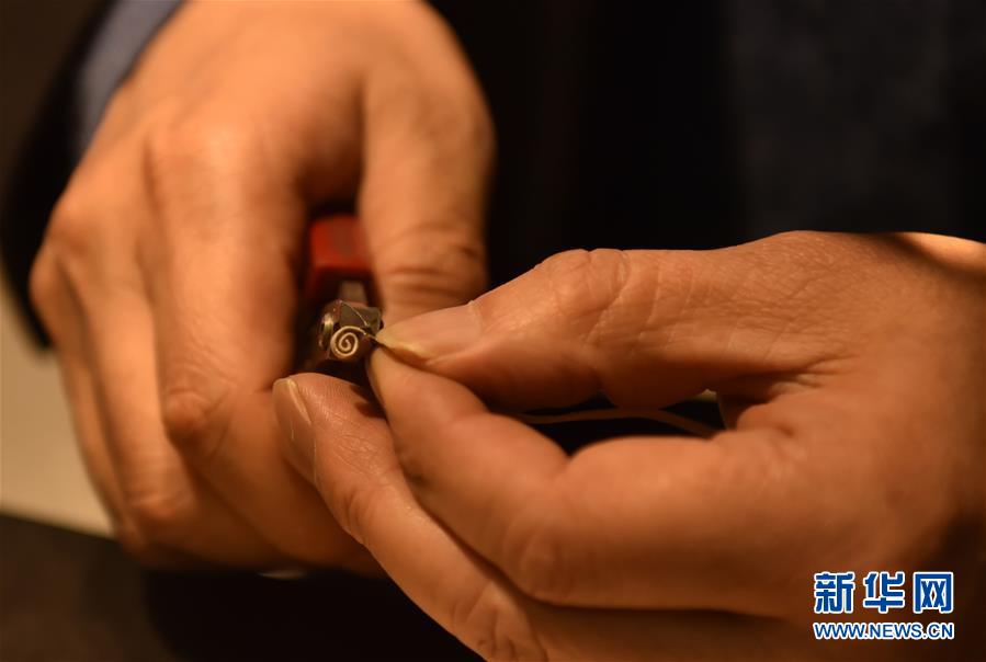 12月17日,董瑞京将花丝制成“卷头”,这是一种基本的花丝造型元素。 新华社发(陈钟昊 摄)