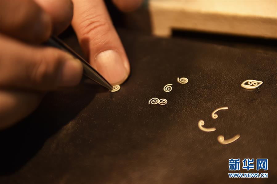 12月17日,董瑞京将花丝制成“卷头”。“卷头”(左)和“小柳儿”(右)是基本的花丝造型元素。 新华社发(陈钟昊 摄)