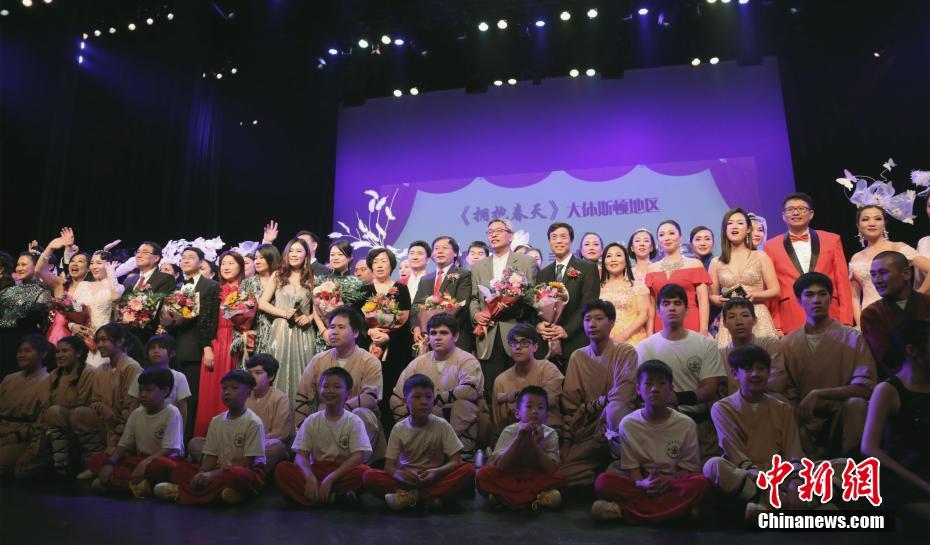 当地时间1月11日晚,美国大休斯敦地区华侨华人举行《拥抱春天》2020年春节联欢晚会。图为晚会结束后,中国驻休斯敦总领馆、中国人活动中心代表等与演职人员合影。中新社记者 曾静宁 摄