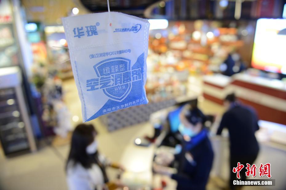 3月17日,书店在人流相对密集处悬挂空气消毒剂。当日,位于呼和浩特市的内蒙古新华书店恢复营业,前来店内购书的民众不多,书店采取消毒措施,并提醒顾客不要长时间在店内停留。中新社记者 刘文华 摄