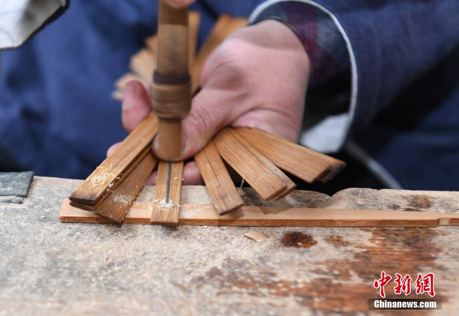 3月19日,一名制扇师傅在打磨竹扇骨架。近日,东京奥运会代购商来到浙江安吉鄣吴镇考察,并定制六合工艺品有限公司制作的中国扇子,作为奥运会的周边纪念礼品。中新社记者 李晨韵 摄
