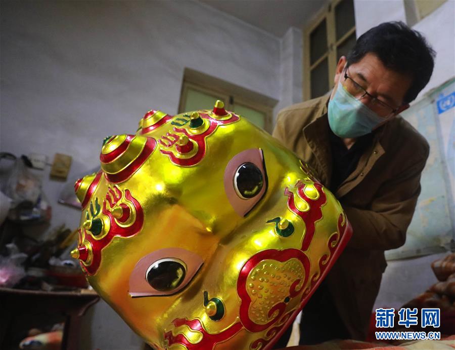 4月2日,在河北省石家庄市正定县,河北省级非遗龙狮道具制作传承人马小增在安装龙狮的眼睛。 随着疫情防控形势持续向好,河北省石家庄市多名非遗手工艺人在做好防护的同时,在家赶制定制手工艺品,通过互联网销往全国各地。 新华社发(刘沛然 摄)