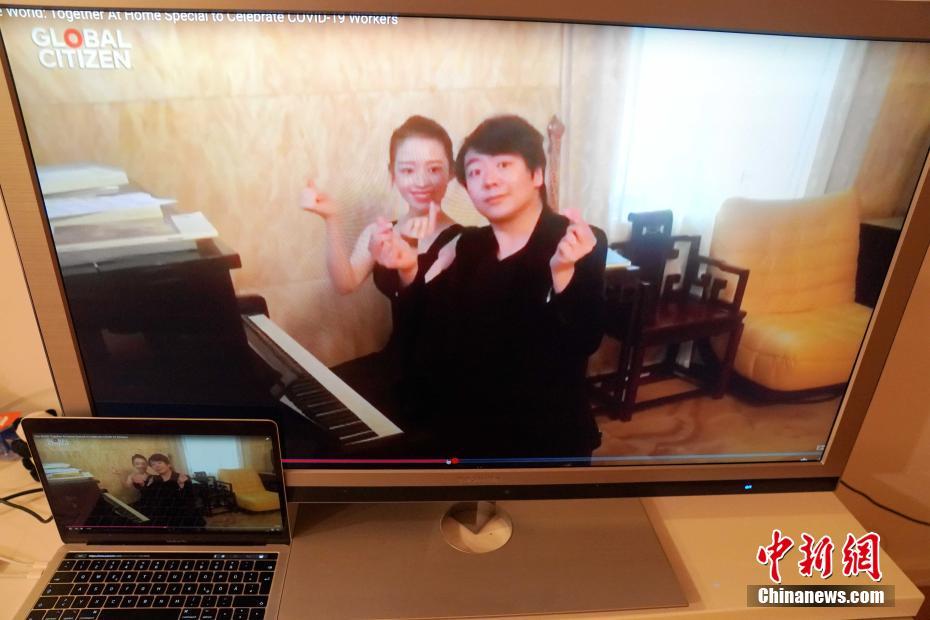 北京时间4月19日凌晨2点至10点 ,世界卫生组织与国际公益组织“全球公民运动”共同举办“同一个世界团结在家”特别慈善音乐会,演出以在线直播的形式举行,全球多国巨星以各种形式参与。图为当地时间4月18日晚在德国柏林直播的“同一个世界团结在家”,郎朗夫妇表演“四手联弹”后“比心”。中新社记者 彭大伟 摄