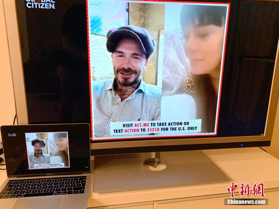 北京时间4月19日凌晨2点至10点 ,世界卫生组织与国际公益组织“全球公民运动”共同举办“同一个世界团结在家”特别慈善音乐会,演出以在线直播的形式举行,全球多国巨星以各种形式参与。图为当地时间4月18日晚在德国柏林直播的“同一个世界团结在家”,英国球星贝克汉姆正在出镜。中新社记者 彭大伟 摄