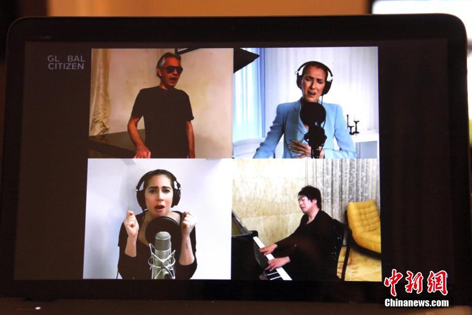 北美东部时间4月18日,由世界卫生组织与国际公益组织“全球公民运动”共同举办、流行音乐歌星Lady Gaga策划的“同一世界:团结在家(One World: Together At Home)慈善音乐会”向全球在线直播,多位华人艺术家与各国明星共同参演,呼吁全世界携手应对新冠疫情。图为安德烈·波切利(左上)、席琳·狄翁(右上)、Lady Gaga(左下)、郎朗(右下)联袂演出的线上画面。中新社记者 余瑞冬 摄