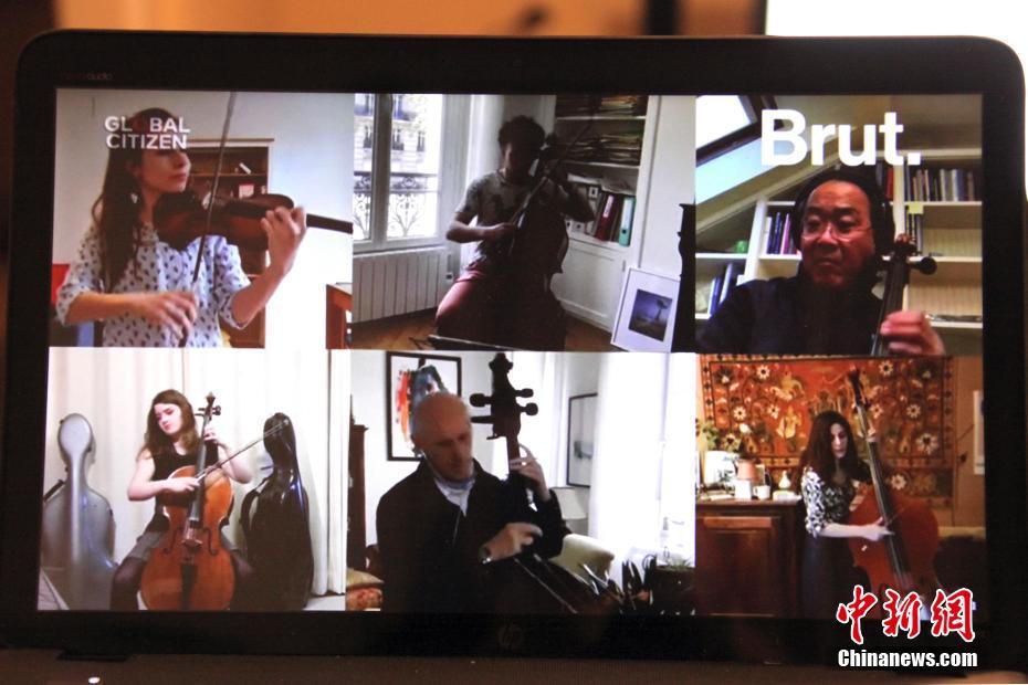 北美东部时间4月18日,由世界卫生组织与国际公益组织“全球公民运动”共同举办、流行音乐歌星Lady Gaga策划的“同一世界:团结在家(One World: Together At Home)慈善音乐会”向全球在线直播,多位华人艺术家与各国明星共同参演,呼吁全世界携手应对新冠疫情。图为大提琴家马友友(右上)与来自全球的音乐家一同隔空演奏。中新社记者 余瑞冬 摄