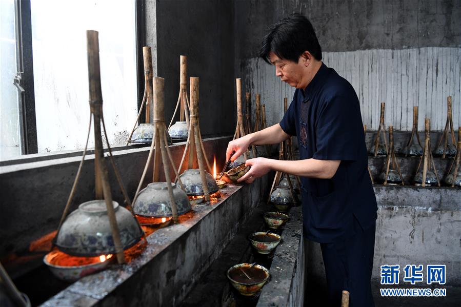 5月21日,安徽省非物质文化遗产徽墨代表性传承人项德胜在进行古法炼烟。传统徽墨制作工艺中,第一道工序就是炼烟。这一过程收集来的油烟是徽墨制作中最为重要的原材料。新华社记者 张端 摄