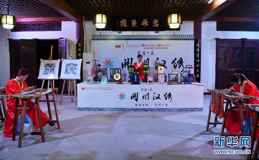 6月11日,工作人员在“双晒”活动中展示推介文创产品——开州汉绣。 当日,第二季重庆“晒旅游精品·晒文创产品”大型文旅推介活动在重庆市开州区汉丰湖畔拉开序幕。在近半年时间内,重庆各区县将通过网络直播、线下营销等形式,轮流推介重庆各地的文化旅游精品和文创产品。 新华社发(刘康 摄)
