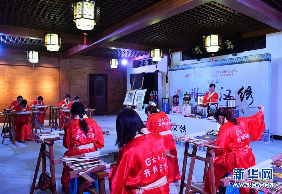 6月11日,工作人员在“双晒”活动中展示推介文创产品——开州汉绣。 当日,第二季重庆“晒旅游精品·晒文创产品”大型文旅推介活动在重庆市开州区汉丰湖畔拉开序幕。在近半年时间内,重庆各区县将通过网络直播、线下营销等形式,轮流推介重庆各地的文化旅游精品和文创产品。 新华社发(刘康 摄)