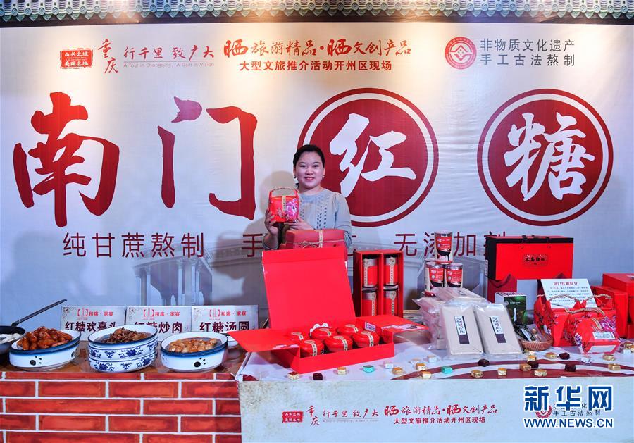 6月11日,工作人员在“双晒”活动中展示推介重庆市非物质文化遗产——开州南门红糖。 当日,第二季重庆“晒旅游精品·晒文创产品”大型文旅推介活动在重庆市开州区汉丰湖畔拉开序幕。在近半年时间内,重庆各区县将通过网络直播、线下营销等形式,轮流推介重庆各地的文化旅游精品和文创产品。 新华社发(刘康 摄)