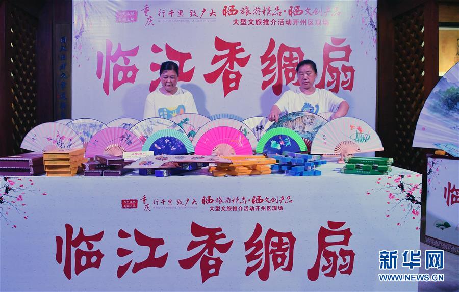 6月11日,工作人员在“双晒”活动中展示推介文创产品——临江香绸扇。 当日,第二季重庆“晒旅游精品·晒文创产品”大型文旅推介活动在重庆市开州区汉丰湖畔拉开序幕。在近半年时间内,重庆各区县将通过网络直播、线下营销等形式,轮流推介重庆各地的文化旅游精品和文创产品。 新华社发(刘康 摄)