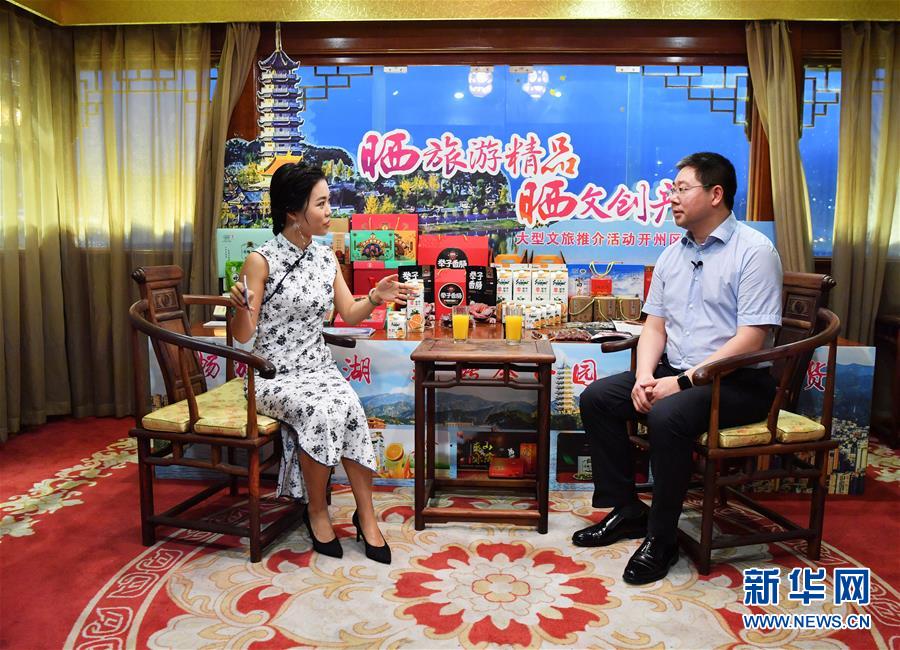 6月11日拍摄的“晒旅游精品·晒文创产品”大型文旅推介活动直播现场。 当日,第二季重庆“晒旅游精品·晒文创产品”大型文旅推介活动在重庆市开州区汉丰湖畔拉开序幕。在近半年时间内,重庆各区县将通过网络直播、线下营销等形式,轮流推介重庆各地的文化旅游精品和文创产品。 新华社发(刘康 摄)