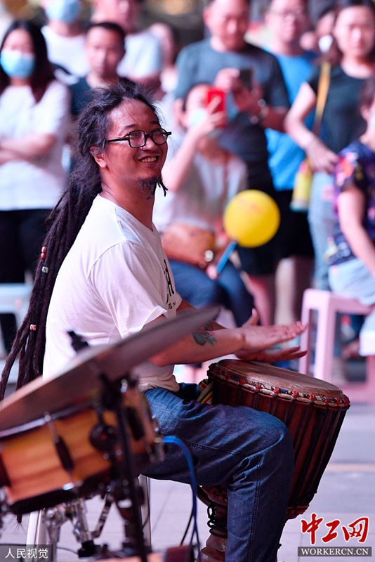 2020年6月5日晚,济南泉城路“夜市”迎来首个周末秀,不少市民赶来游逛这“既熟悉又陌生”的热闹商业“金街”。几只乐队分布在泉城路不同的地段,图为在路边激情演奏的鼓手。图片来源:人民视觉