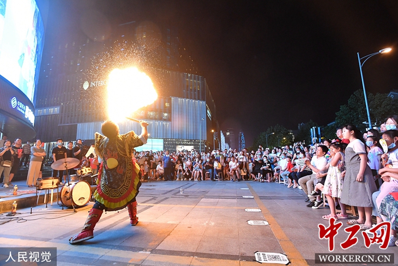 2020年6月5日晚,济南泉城路“夜市”迎来首个周末秀,不少市民赶来游逛这“既熟悉又陌生”的热闹商业“金街”。图为夜市上,市民围观四川变脸及喷火绝活。图片来源:人民视觉