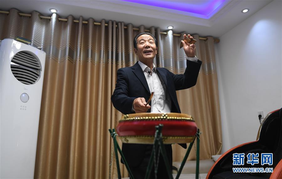 6月12日,在宿迁市宿城区,牛崇祥在家中直播表演苏北大鼓。 今年57岁的江苏宿迁市民牛崇祥是苏北大鼓第八代传人。他从17岁开始拜师学艺,致力于苏北大鼓艺术的传承与发展。近年来,除了参加各类曲艺比赛、展演等活动外,牛崇祥还将传播舞台扩展至网络直播平台,线上弘扬优秀传统文化。目前,牛崇祥拥有粉丝3万多人。 新华社记者 季春鹏 摄