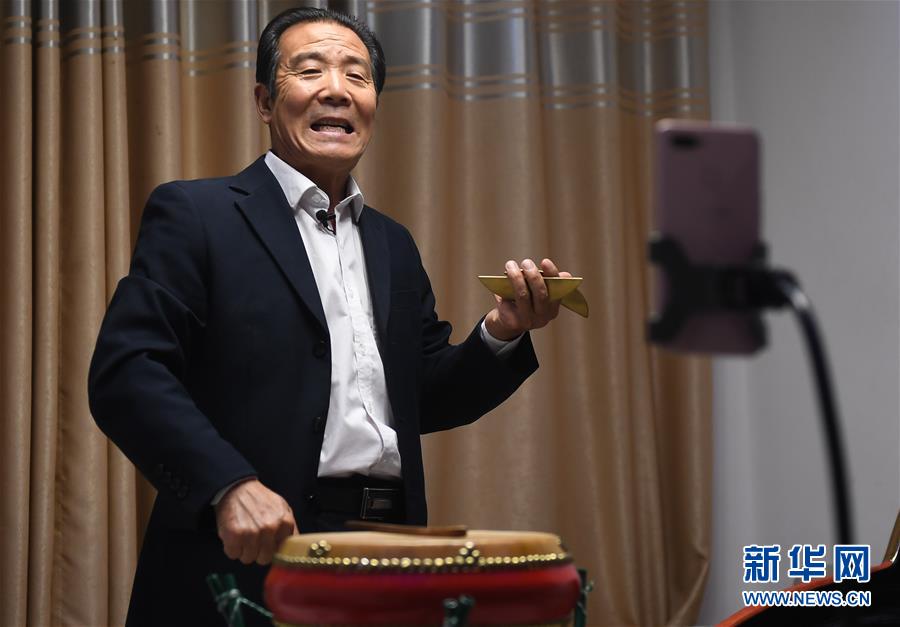 6月12日,在宿迁市宿城区,牛崇祥在家中直播表演苏北大鼓。 今年57岁的江苏宿迁市民牛崇祥是苏北大鼓第八代传人。他从17岁开始拜师学艺,致力于苏北大鼓艺术的传承与发展。近年来,除了参加各类曲艺比赛、展演等活动外,牛崇祥还将传播舞台扩展至网络直播平台,线上弘扬优秀传统文化。目前,牛崇祥拥有粉丝3万多人。 新华社记者 季春鹏 摄