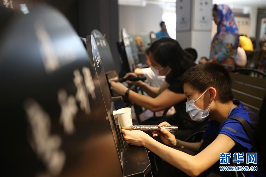 6月13日,小朋友在福建省厦门惠和石文化园举行的非遗亲子活动中体验石影雕制作技艺。