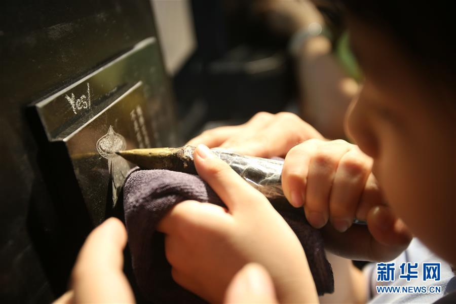 6月13日,小朋友在福建省厦门惠和石文化园举行的非遗亲子活动中体验石影雕制作技艺。新华社发(曾德猛 摄)