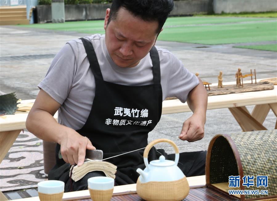 6月13日,武夷竹编制作技艺手工艺人在福建省武夷山市举办的非物质文化遗产传承活动中展示竹编技艺。新华社发(陈颖 摄)