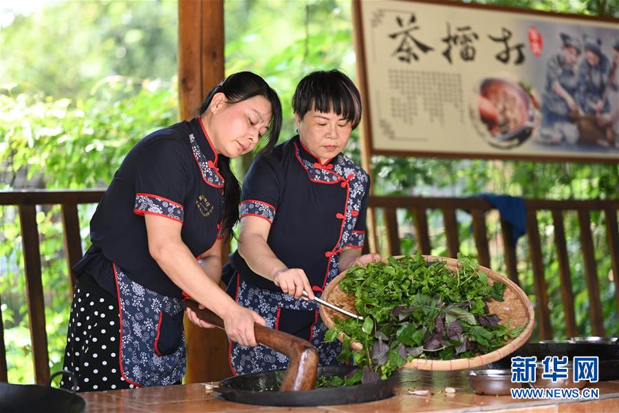 6月13日,在广西柳州市柳江区进德镇三千村,工作人员在当地举行的非遗活动中制作客家打擂茶。新华社发(黎寒池 摄)