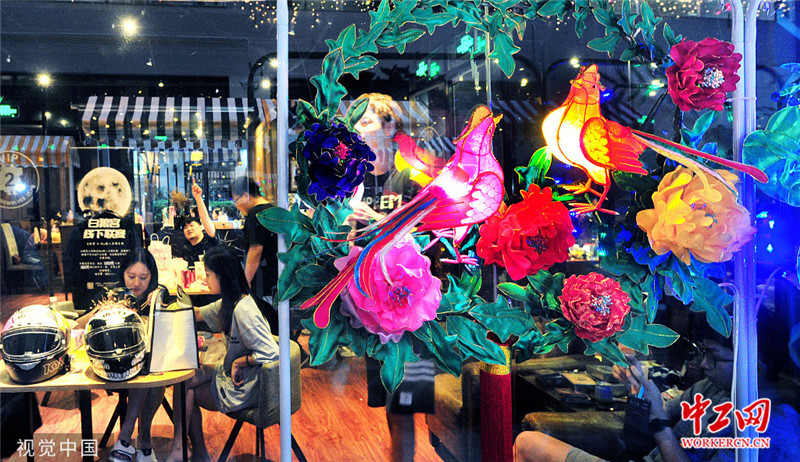 2020年6月14日,上海,2020年黄浦区“文化和自然遗产日”系列活动——“非遗”文化集市暨“上海灯彩”展示活动在8号桥创意产业园三期举行。当夜幕降临,国家级非遗项目上海灯彩展示的金鱼、鲤鱼、喜鹊等花鸟灯组充满立体感,点亮了8号桥创意产业园,吸引不少市民游客纷纷前来赏灯赶集。(杨建正/视觉中国)