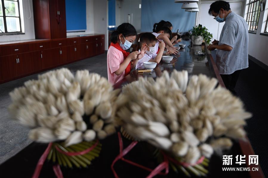 6月17日,湖州市善琏湖笔厂的技师在择笔车间教授小朋友完成择笔工序。浙江省湖州市南浔区善琏镇是中国湖笔的故乡。2015年以来,南浔镇善琏镇先后投入32.06亿元建设湖笔小镇,目前,小镇共有湖笔相关经营主体358家,2019年实现产值8.3亿元,占全国毛笔销售市场的30%,其中中高档毛笔市场占有率达60%。新华社记者黄宗治摄