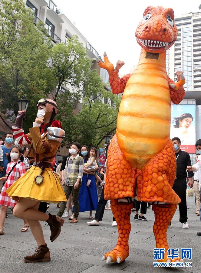 6月19日,游客在上海新天地观看“恐龙巡游”表演。新华社记者 陈飞 摄