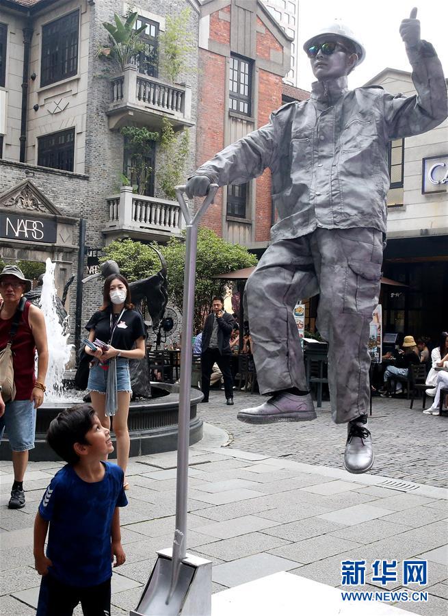 6月19日,游客在上海新天地观看太空悬浮表演。新华社记者 陈飞 摄
