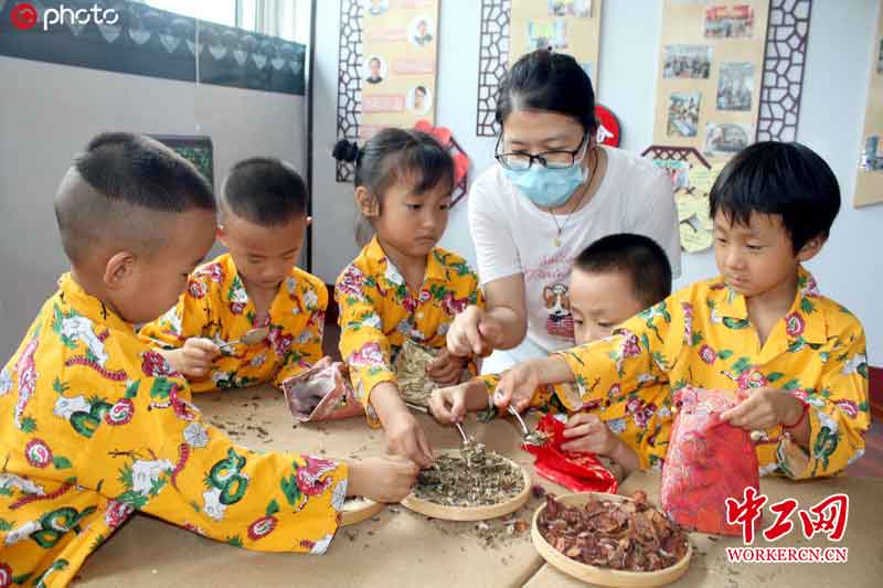 6月22日,江苏省苏州市虎丘中心幼儿园的孩子在用中药制作香包。王建康/IC photo