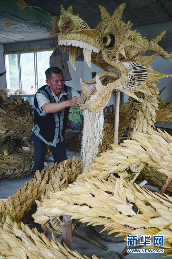 6月23日,在广西龙胜各族自治县平等镇广南侗寨,村民在整理刚刚编织好的草龙。 端午节临近,在广西龙胜各族自治县平等镇广南侗寨,侗族同胞赶制草龙迎接传统佳节。编织草龙是当地侗族一项独特的民间技艺,每逢重大节庆,侗族同胞都有舞草龙祈福的习俗。草龙以稻草为主要材料,辅以竹木做支架,采用编、插、嵌、剔、镂等十多种工艺,整条草龙用100多斤、数万根稻草编成,做工精细,惟妙惟肖。 新华社发(黄勇丹 摄)
