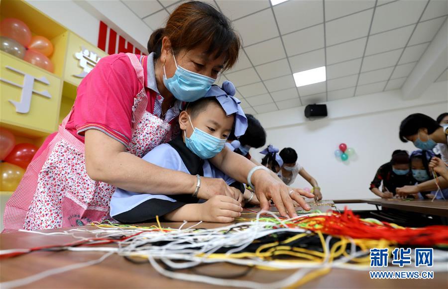6月24日,在石家庄市桥西区汇通街道留村社区,社区小朋友在大人的指导下学编五彩绳。 端午佳节将至,各地群众举行了多种多样的活动迎接这一传统节日。 新华社发(梁子栋 摄)