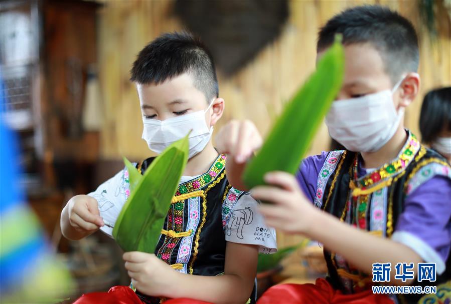 6月24日,贵州省铜仁市玉屏侗族自治县皂角坪中心幼儿园的小朋友在“包粽子 迎端午”主题活动中体验包粽子。 端午佳节将至,各地群众举行了多种多样的活动迎接这一传统节日。 新华社发(欧秀灯 摄)