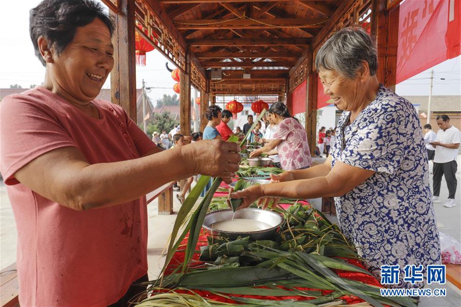 6月24日,在河北唐山遵化市堡子店镇郎仲庄村的村民活动中心,村民们在进行包粽子比赛。 端午佳节将至,各地群众举行了多种多样的活动迎接这一传统节日。 新华社发(刘满仓 摄)