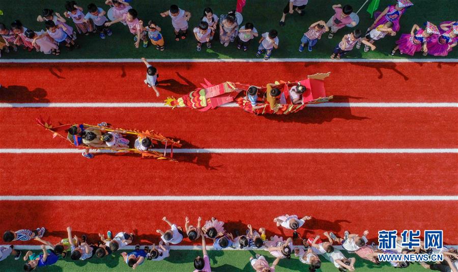6月24日,四川省遂宁市兴子堂幼稚园的孩子们正在操场上玩“旱地划龙舟”(无人机照片)。 端午佳节将至,各地群众举行了多种多样的活动迎接这一传统节日。 新华社发(刘昌松 摄)