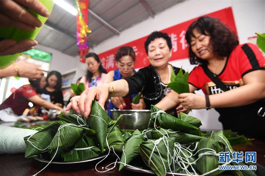 6月24日,贵阳市南明区遵义街道办事处体育路居委会“粽满飘香,情满街道”端午主题活动中,辖区群众在一起包粽子。 端午佳节将至,各地群众举行了多种多样的活动迎接这一传统节日。 新华社发(赵松 摄)