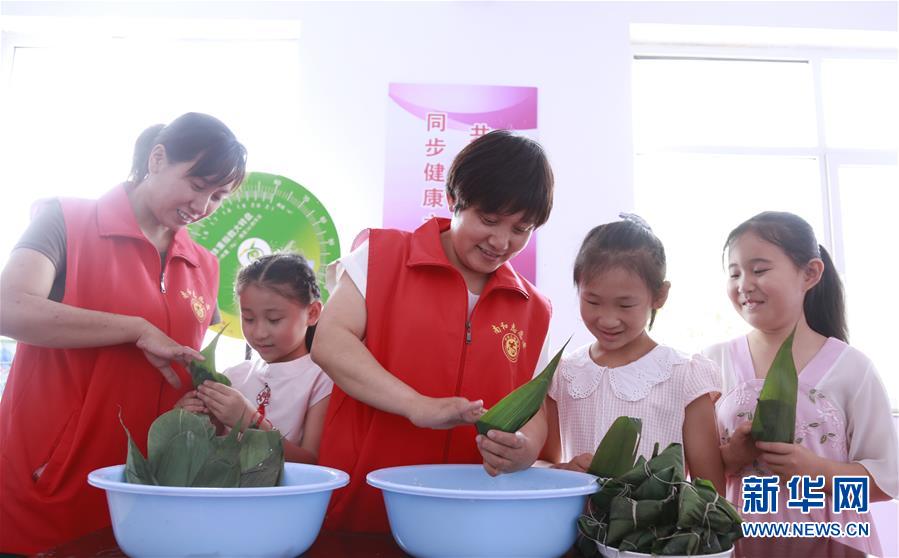 6月24日,河北省邢台市南和区三思乡卫生院的志愿者在南韩村和小朋友一起包粽子。 端午佳节将至,各地群众举行了多种多样的活动迎接这一传统节日。 新华社发(张驰 摄)